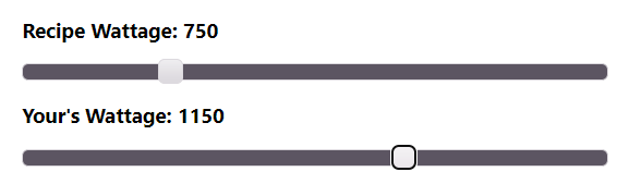 We believe a slider is the ideal input for wattage level. We had learned that the range of common watt levels goes from 500w to 1500w. Using the jQuery UI slider, we can set increments of 50. For recipe wattage, we default to 700 (most common for package’s recipes). For our mike’s wattage, default is 950.