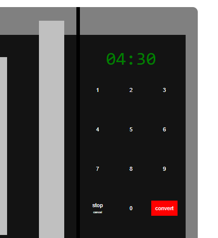 We found a cool working microwave simulator and re-purposed it for our needs, namely, to enter values that set the clock. Then, instead of a Start button, we make a “Convert” button. When the user clicks it, the calculation is done. (First step being to convert number input into “seconds.” )