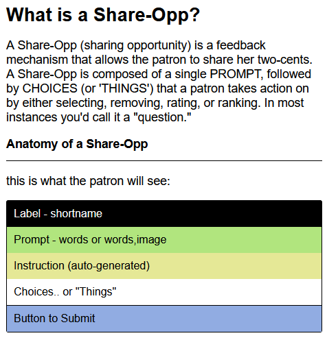 We have discussed the inspiration for a polling system, learned the structure of a share-opp, the various types of share-opp, and how they get made by the admin of a business. The SQL data generated by the creation process will be in turn used to render it. In future posts, we will discuss the Display of the Share-Opp, the Interaction with a Customer, the Recording of the Response, and the Viewing of the Response Data.